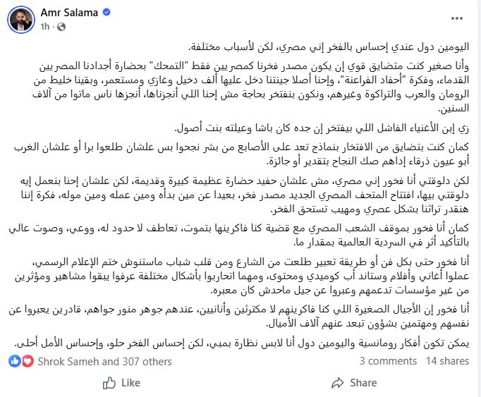 وقال عمرو سلامة في منشور مطوّل عبر حسابه الرسمي بموقع “فيسبوك”: "اليومين دول عندي إحساس بالفخر إني مصري، لكن لأسباب مختلفة، وأنا صغير كنت متضايق إن مصدر فخرنا يكون بس التمحك بحضارة أجدادنا القدماء، مع إننا بقينا خليط من شعوب كتير، ونفتخر بحاجة مش إحنا اللي أنجزناها".