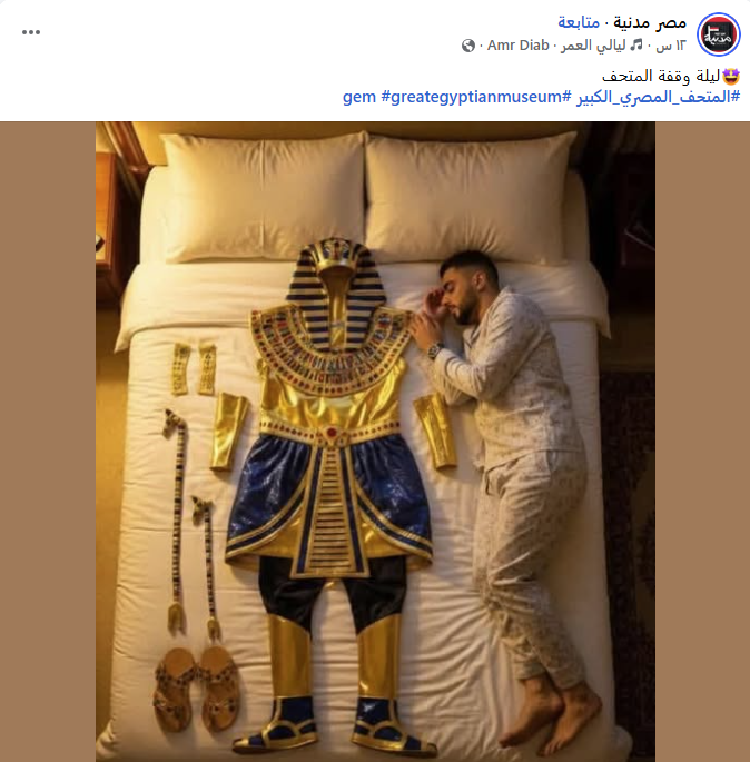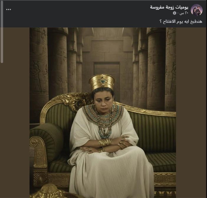 من أبرز المنشورت المتداولة، صور صنعت بتقنيات الذكاء الاصطناعي، لشاب ينام على سرير بجانب رداء ملكي فرعوني، محاكاة لليلة العيد، ما يعكس حالة الانتظار للاحتفال بالحدث.