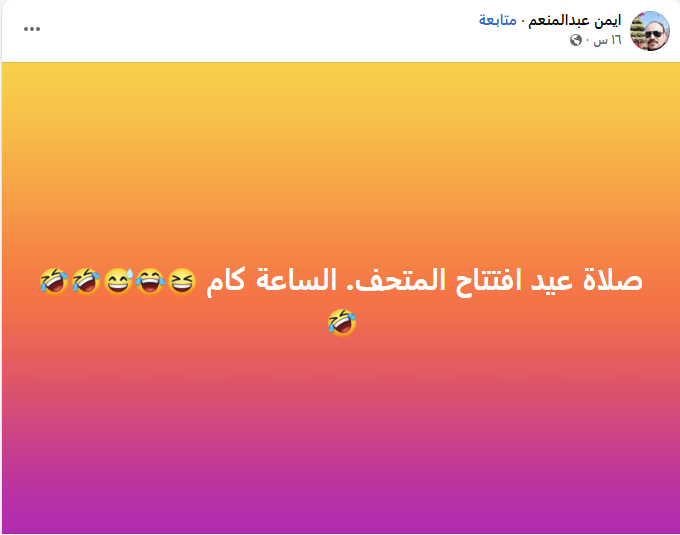 وتداول بعض المؤثرين منشورًا ساخرًا، تساءلوا فيه عن موعد صلاة المتحف، لمشابهة الأجواء بليلة العيد.