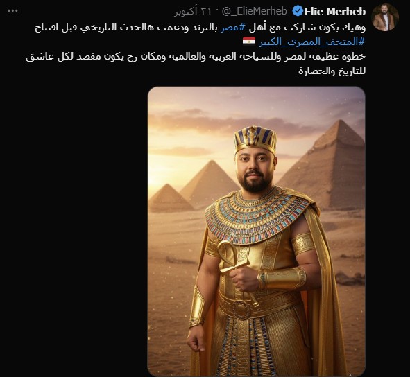 وظهر الإعلامي اللبناني إيلي مرعب مرتديًا زي القدماء المصريين، قائلًا: "وهيك بكون شاركت مع أهل مصر بالترند ودعمت هالحدث التاريخي قبل الافتتاح. خطوة عظيمة لمصر وللسياحة العربية والعالمية، ومكان رح يكون مقصد لكل عاشق للتاريخ والحضارة".