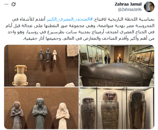 ومن العراق، كتبت المؤثرة زهراء جمال: "بمناسبة اللحظة التاريخية لافتتاح المتحف المصري الكبير، أتقدم للأشقاء في المحروسة مصر بهدية متواضعة، وهي مجموعة صور التقطتها في الجناح المصري لمتحف الأرميتاج في روسيا، الذي يضم آثارًا حقيقية من حضارة مصر".