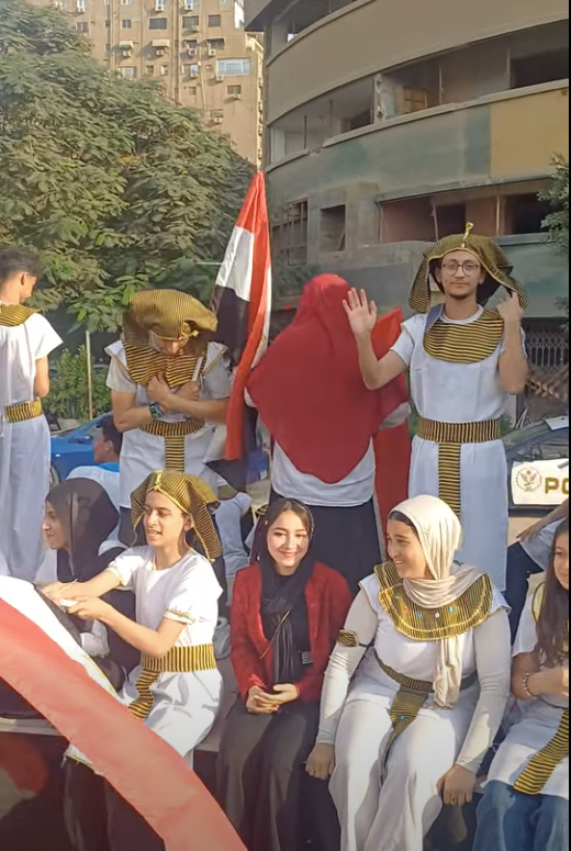 وفي الشوارع، رأينا المصريين يتجمعون بالأعلام المصرية والأغاني الوطنية، يتراقصون على أنغام حب الوطن، ويهللون بهذا الحدث الذي يترقبه العالم كله، عربي وأجنبي، كما ارتدى الكثير الأزياء الفرعونية افتخارًا وفرحًا.
