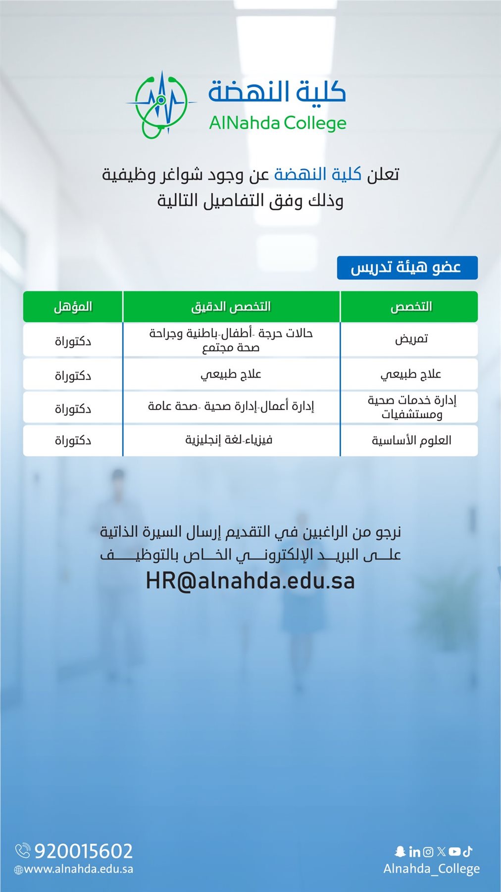 أعلنت كلية النهضة بالرياض في المملكة العربية السعودية عن حاجتها إلى أعضاء هيئة تدريس ووظائف أكاديمية في عدد من التخصصات.