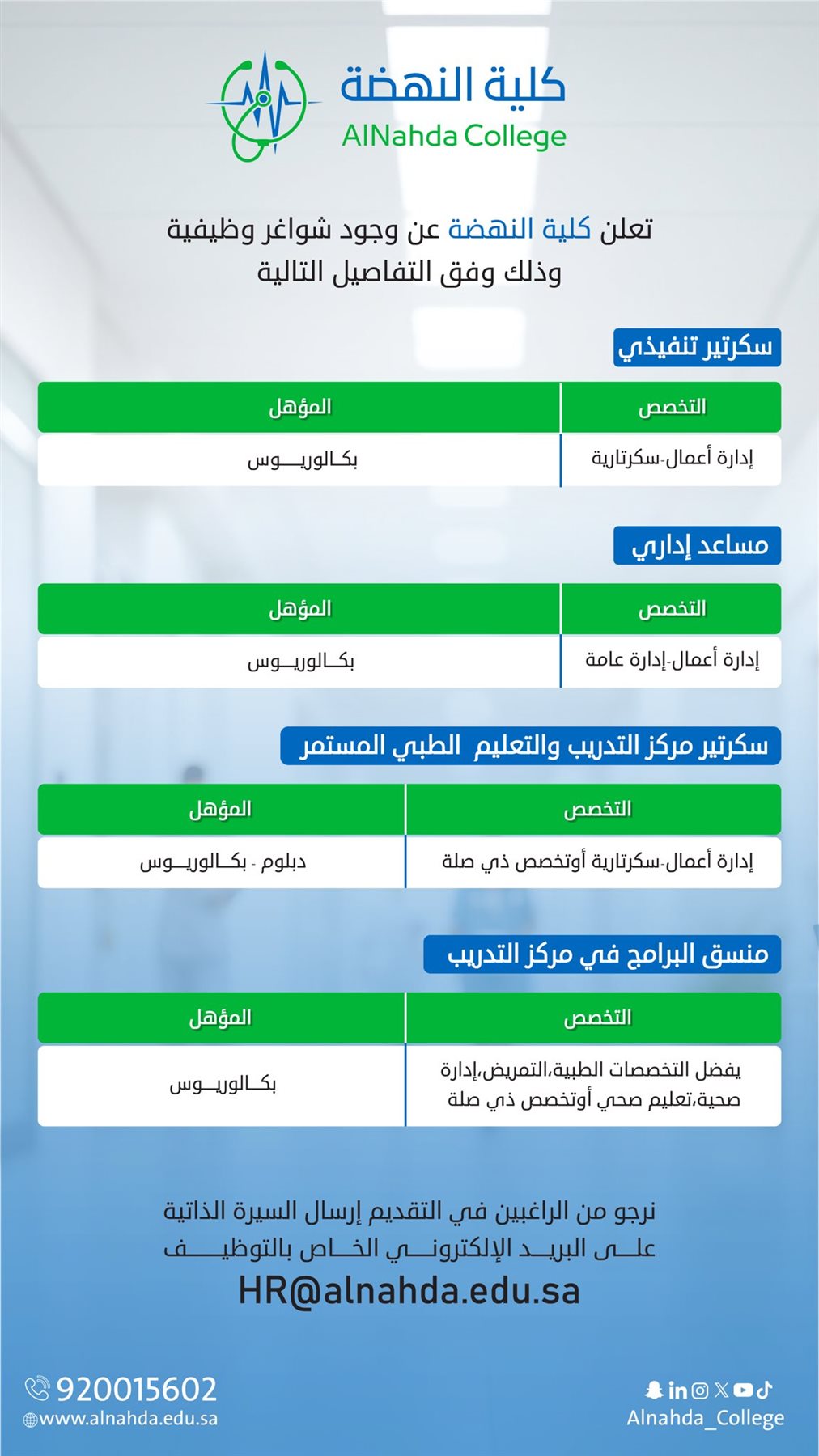 التخصصات المطلوبة في وظائف كلية النهضة بالرياض