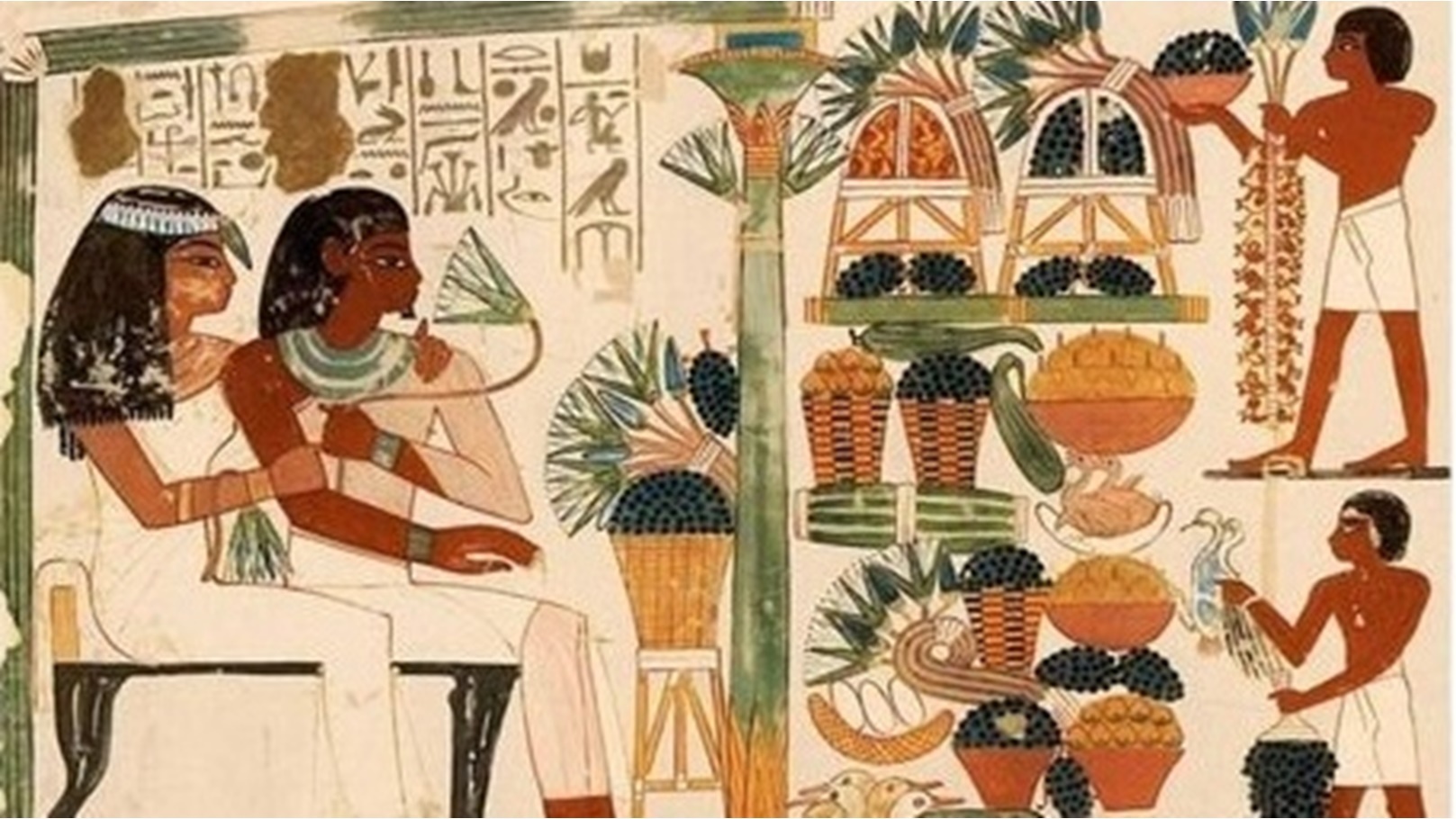 كما امتلأت سلال المصريين القدماء بأطيب الثمار من التمر والعنب والتين والرمان، وكانت تقدم طازجة أو مجففة، فيما مثل العسل الطبيعي كنزًا غذائيًا وحلوى مفضلة تستخدم في الطقوس والمناسبات الخاصة.