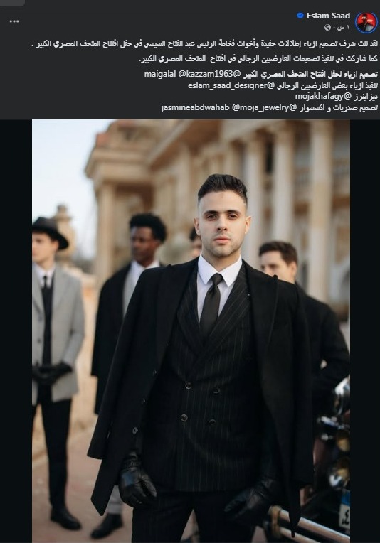 وكتب إسلام عبر صفحته: “لقد نلت شرف تصميم أزياء إطلالات حفيدة وأخوات فخامة الرئيس عبد الفتاح السيسي في حفل افتتاح المتحف المصري الكبير”.
