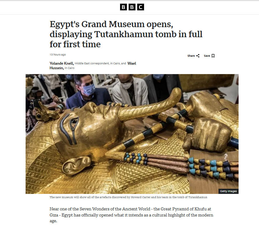 أما هيئة الإذاعة البريطانية "بي بي سي"، فقالت إن المتحف الكبير الذي تجاوزت تكلفته 1.2 مليار دولار، مرشح لأن يصبح وجهة سياحية رئيسية تستقبل نحو 8 ملايين زائر سنويًا، ما يمنح السياحة المصرية دفعة قوية بعد سنوات من التراجع.