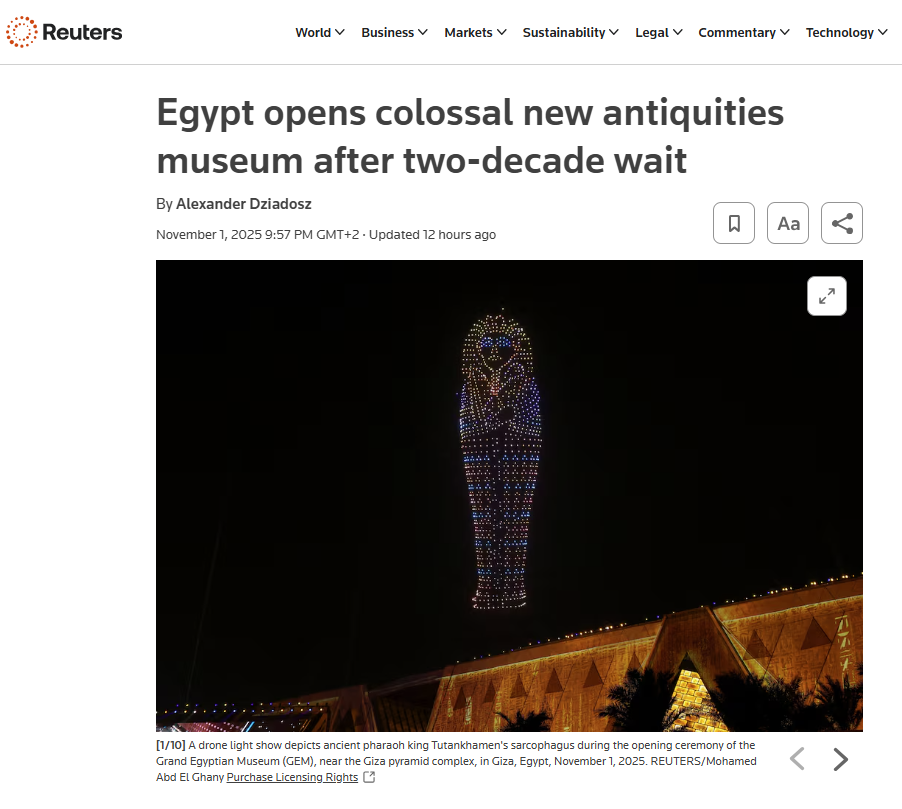 في تقرير، قالت وكالة "رويترز" إن المتحف المصري الكبير ليس تكرارًا لمتحف اللوفر أو المتحف البريطاني، بل هو رد مصر الحضاري عليهما، إذ ولدت تلك المتاحف من رحم الإمبراطوريات، بينما نشأ المتحف المصري الكبير من أصالة الجذور المصرية.