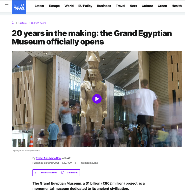 وتناولت صحيفة "يورو نيوز" الحدث بوصفه أكبر افتتاح متحفي في القرن الواحد والعشرين، مشيرةً إلى أن المشروع الذي بلغت تكلفته مليار دولار يضم أكثر من 50 ألف قطعة أثرية، بينها المجموعة الكاملة لكنوز مقبرة الملك توت عنخ آمون التي تعرض كاملة لأول مرة.