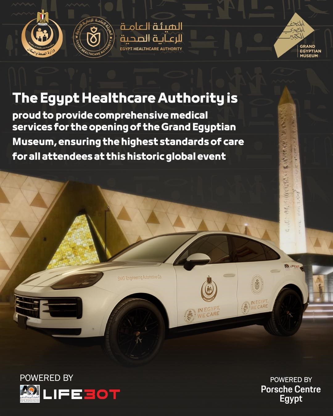 أعلنت الهيئة العامة للرعاية الصحية عن إطلاق أول سيارة لتقديم خدمات طبية طارئة "بورشة كايين كوبيه" مزودة بنظام متكامل لغرفة عناية مركزة متنقلة، ضمن مبادرة “نرعاك في مصر”، لتقديم خدمات طبية عالمية المستوى للمرضى الأجانب داخل مصر، وذلك في افتتاح المتحف المصري الكبير بالأمس.