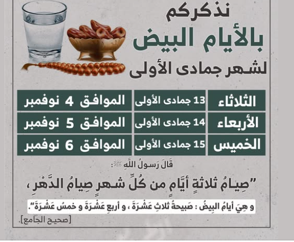 وعليه فإن الأيام البيض لشهر جمادى الأولى 1447 توافق:
