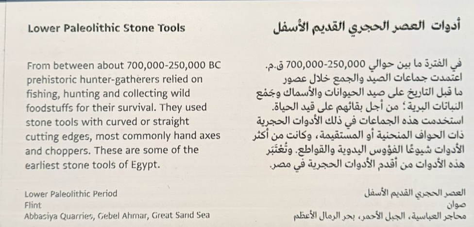 وقد أوضح الدليل الإرشادي أمام البلطة في المتحف المصري الكبير، أن جماعات الصيد اعتمدت خلال عصور ما قبل التاريخ على صيد الحيوانات والأسماك وجمع النباتات البرية، من أجل بقائهم على قيد الحياة، في الفترة ما بين حوالي 250 ألف سنة إلى 700 ألف سنة ق.م.