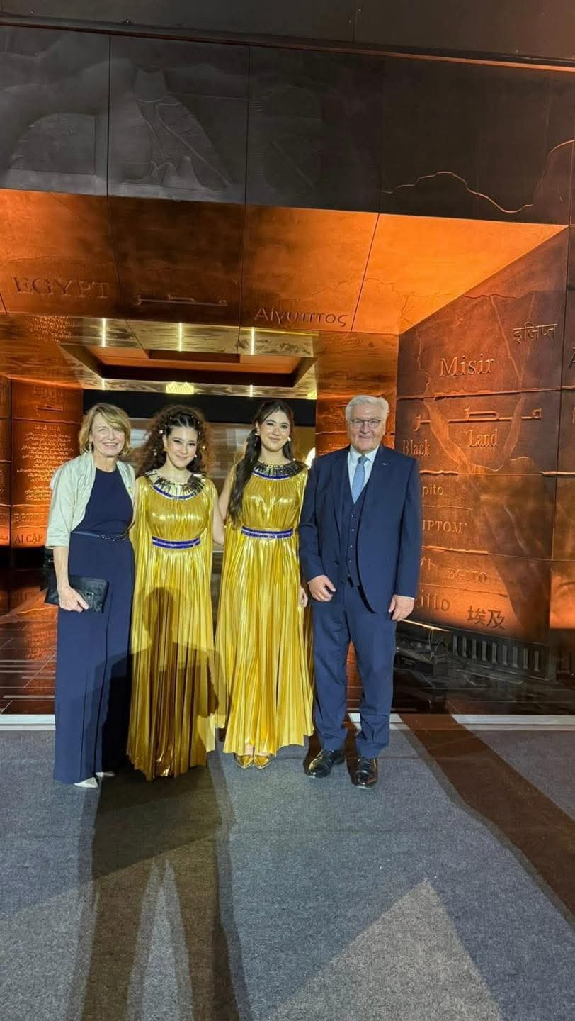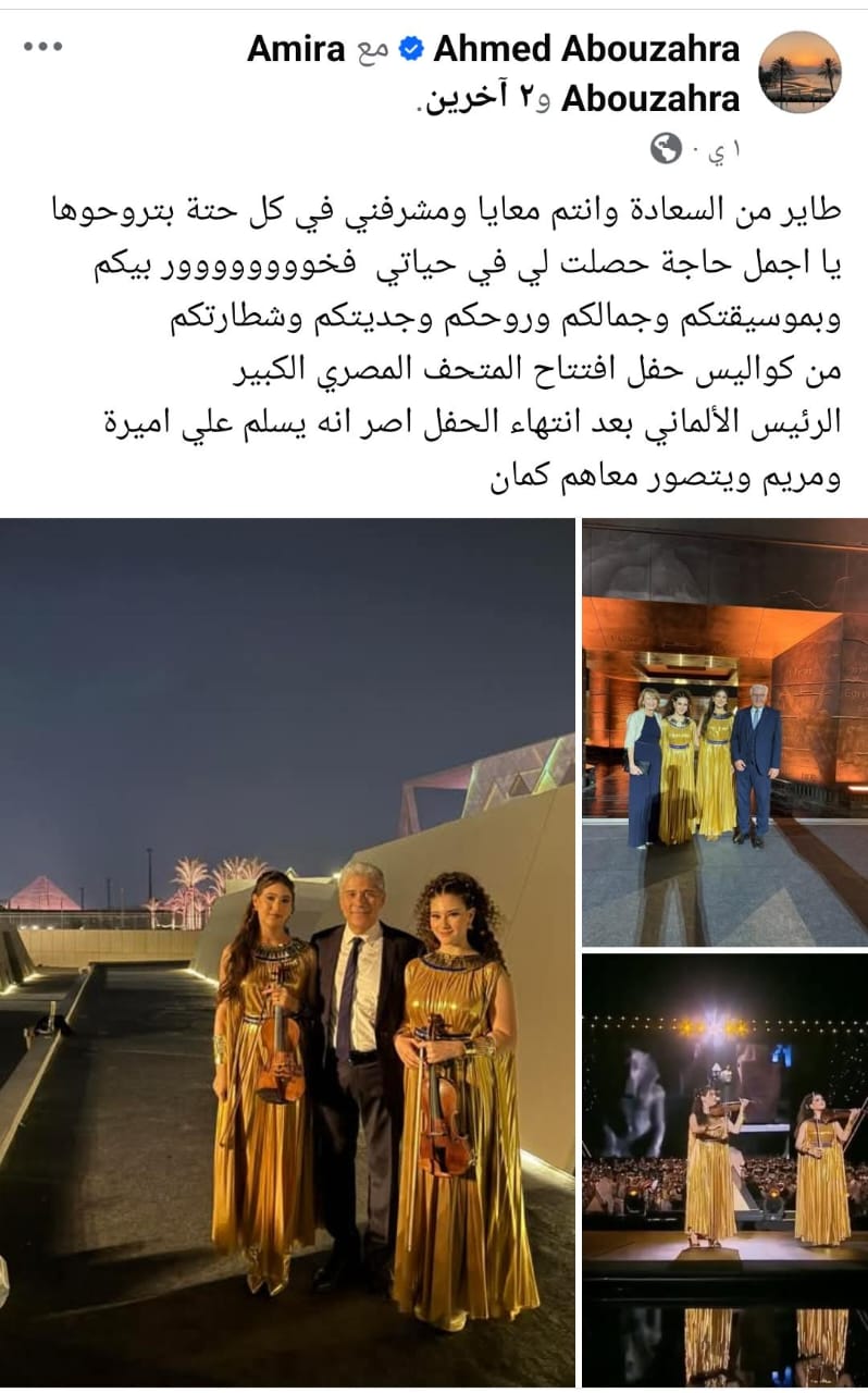 وكتب الموسيقار أحمد أبو زهرة على حسابه الشخصي بفيسبوك، عن حرص الرئيس الألماني على الالتقاء بأميرة ومريم بعد انتهاء الحفل، والتقاط صورة تذكارية برفقتهم بعد الإشادة بهما.