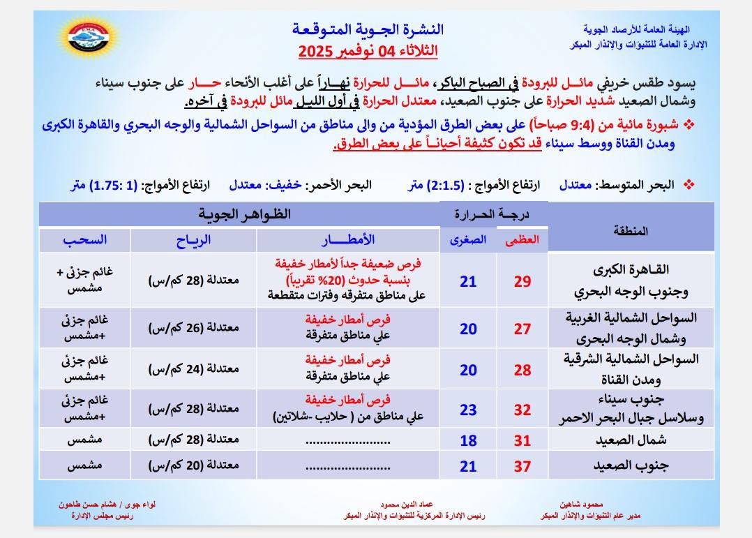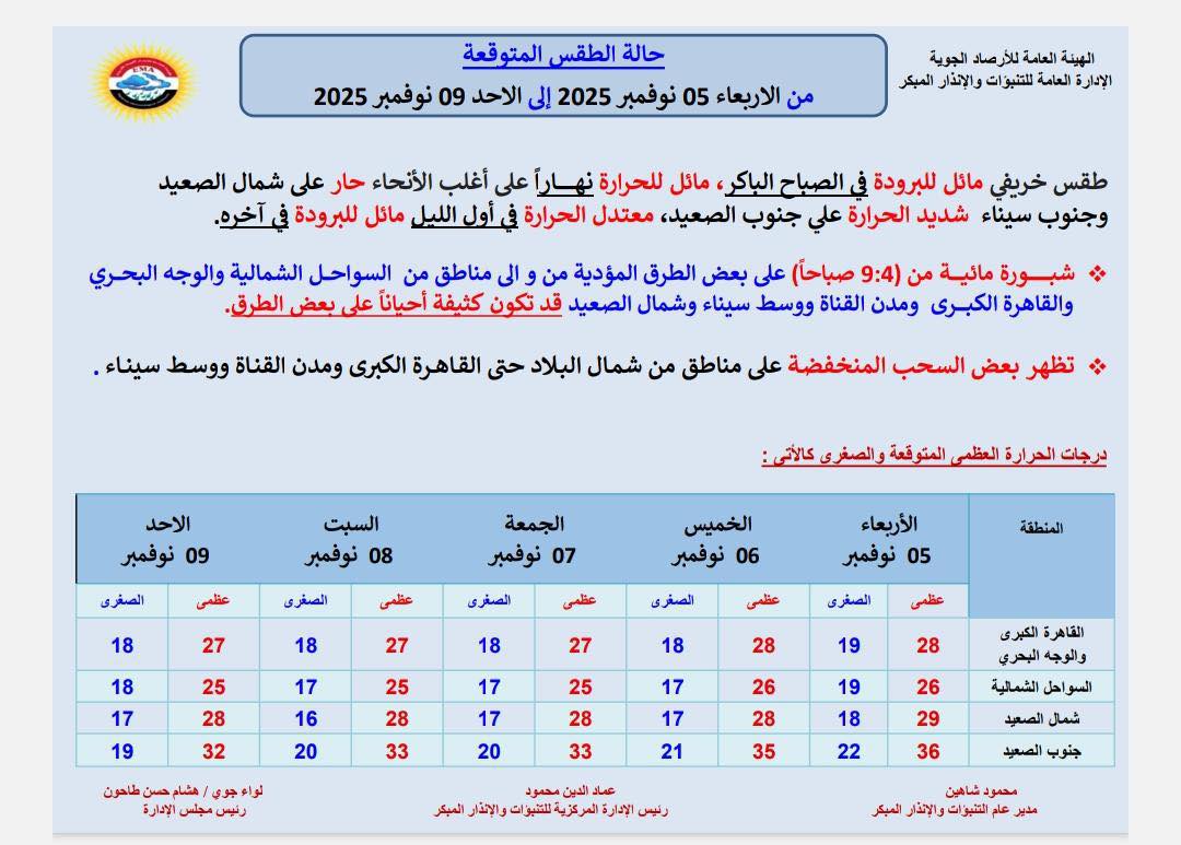 أما عن الظواهر الجوية، فتظهر شبورة مائية صباحًا على مناطق من شمال البلاد حتى القاهرة الكبرى وشمال الصعيد ووسط سيناء، وقد تكون كثيفة أحيانًا على بعض الطرق.