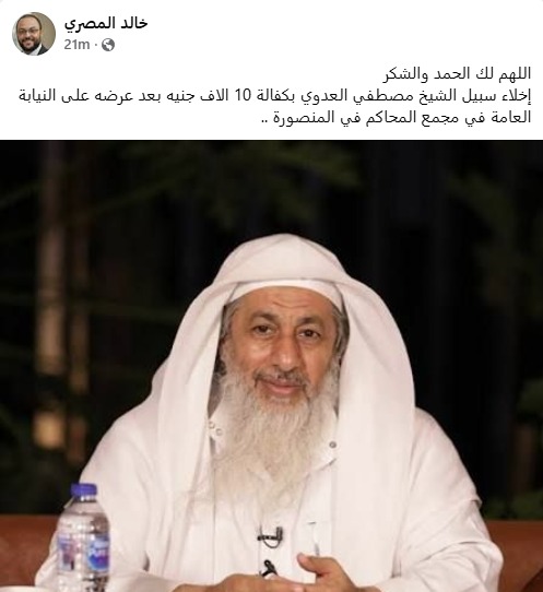 أعلن المحامي خالد المصري، عبر حسابه الشخصي على فيس بوك، أن جهات التحقيق المختصة قررت إخلاء سبيل الشيخ مصطفى العدوي بكفالة مالية قدرها 10 آلاف جنيه.