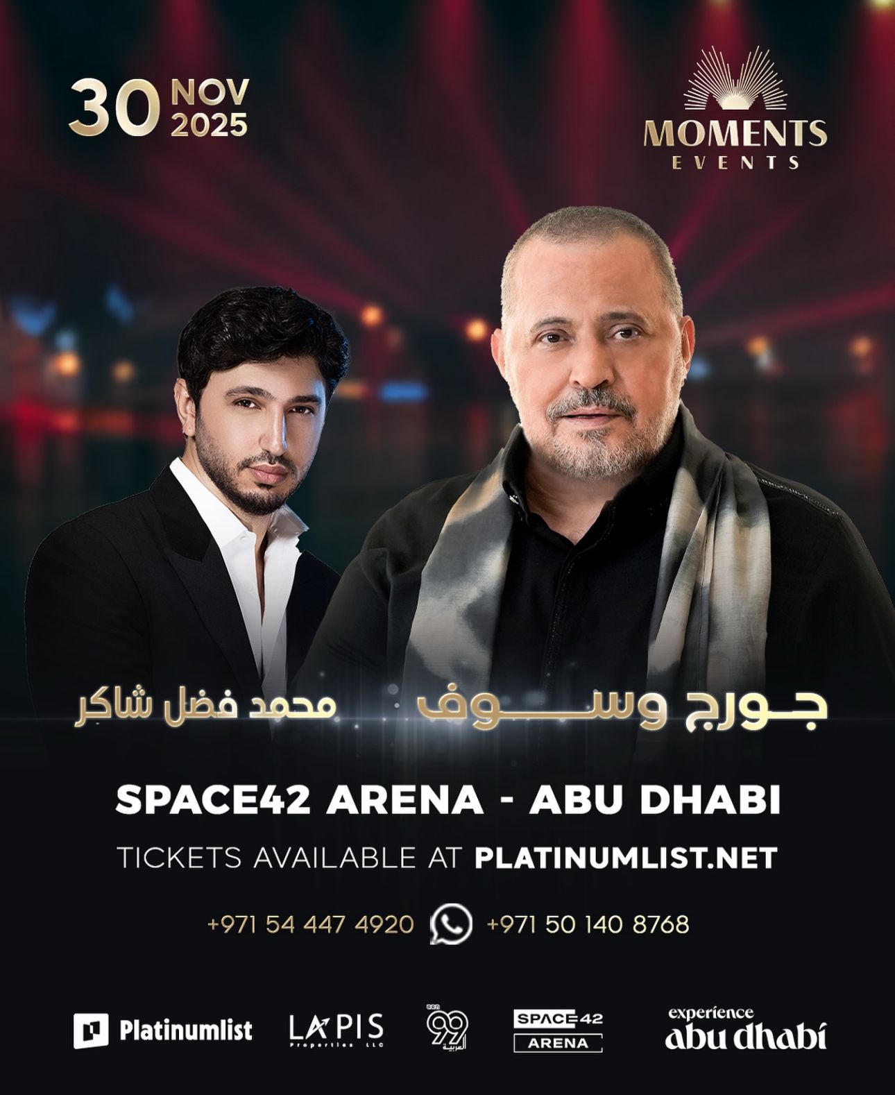 تستعد مدينة أبوظبي الإماراتية لاحتضان ليلة استثنائية من الطرب والحنين، يحييها كل من سلطان الطرب جورج وسوف والفنان محمد فضل شاكر يوم 30 نوفمبر الجاري على مسرح SPACE42 ARENA.