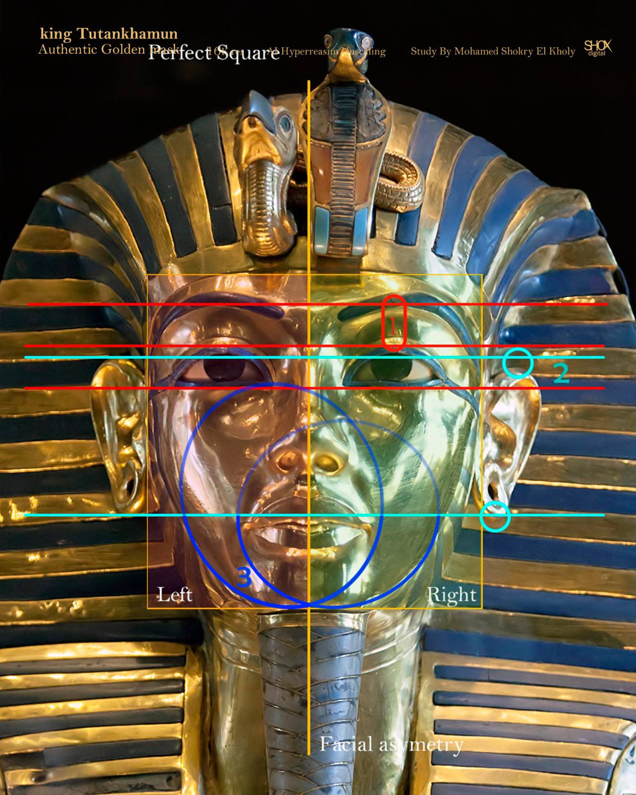 كما وجد اختلافًا في عرض عظمة الفك في الجانب الأيمن، عن الجانب الآخر، وأيضًا في درجة ميلها، ولاحظ أن الأذن الموجودة في الجانب الأيسر منخفضة قليلًا في درجة الارتفاع عن الأخرى، بنسبة 3 مللم، وكان آخر اكتشاف في وجه قناع الملك توت عنخ آمون يتمثل في عدم تماثل التجويف السفلي في العنينين عن بعضهما البعض.