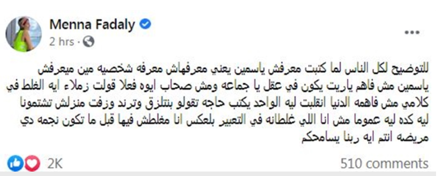 وبعد أيام، خرجت منة فضالي، للرد على الانتقادات التي تعرضت لها، عبر حسابها الرسمي على منصة “فيسبوك” وقالت: “للتوضيح لكل الناس.. لما كتبت معرفش ياسمين يعني معرفهاش معرفة شخصية.. مين ميعرفش ياسمين مش فاهم ياريت يكون في عقل يا جماعة ومش صحاب أيوه فعلًا قولت زملاء ايه الغلط في كلامي”.