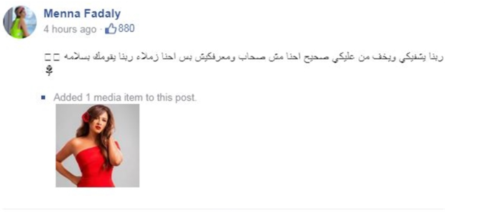 وكتبت لها منة فضالي: “ربنا يشفيكي ويخف من عليكي، صحيح إحنا مش صحاب ومعرفكيش، بس إحنا زملاء، ربنا يقومك بالسلامة”، حيث كانت كلمة “معرفكيش” هي محل الهجوم على منة فضالي.
