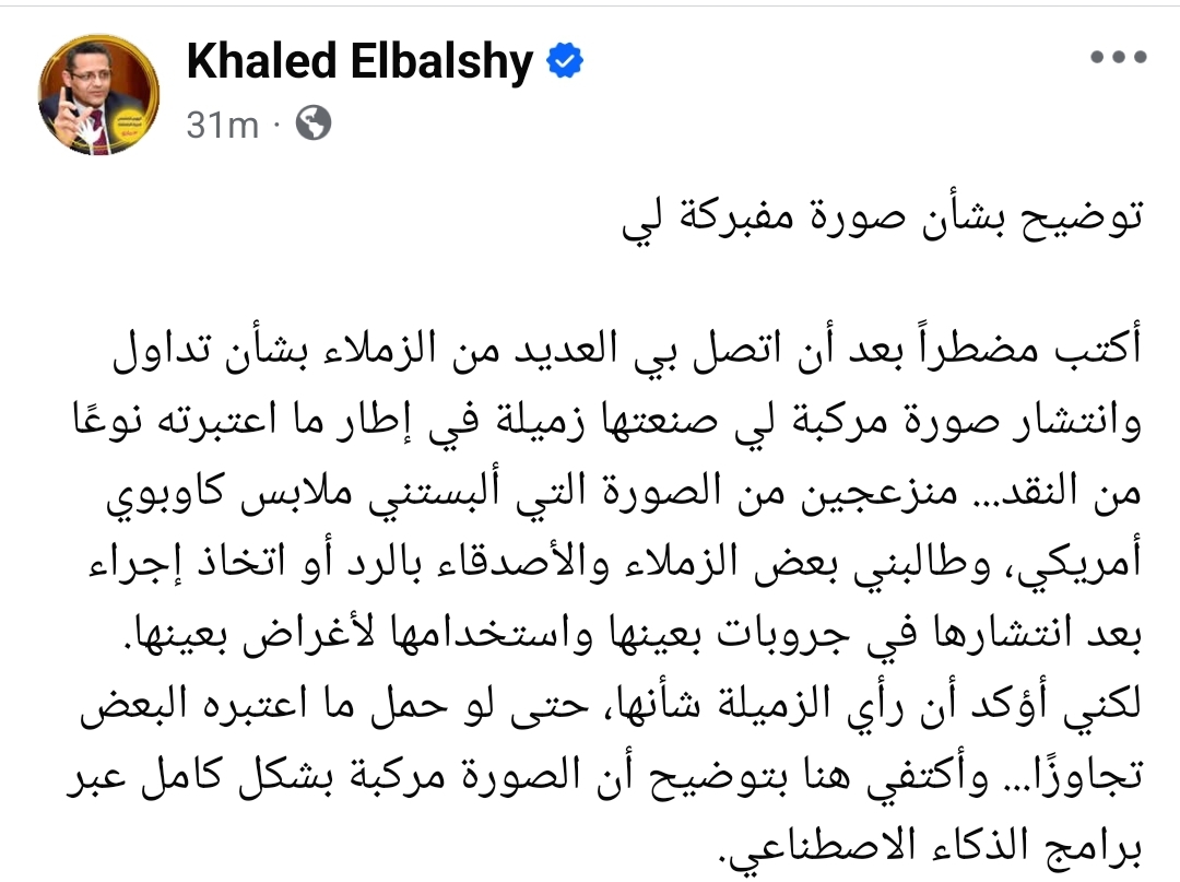 وكتب نصًا عبر حسابه الموثق بالعلامة الزرقاء: “توضيح بشأن صورة مفبركة لي.. أكتب مضطرًا بعد أن اتصل بي العديد من الزملاء بشأن تداول وانتشار صورة مركبة لي صنعتها زميلة في إطار ما اعتبرته نوعًا من النقد.. منزعجين من الصورة التي ألبستني ملابس كاوبوي أمريكي، وطالبني بعض الزملاء والأصدقاء بالرد أو اتخاذ إجراء بعد انتشارها في جروبات بعينها واستخدامها لأغراض بعينها”.