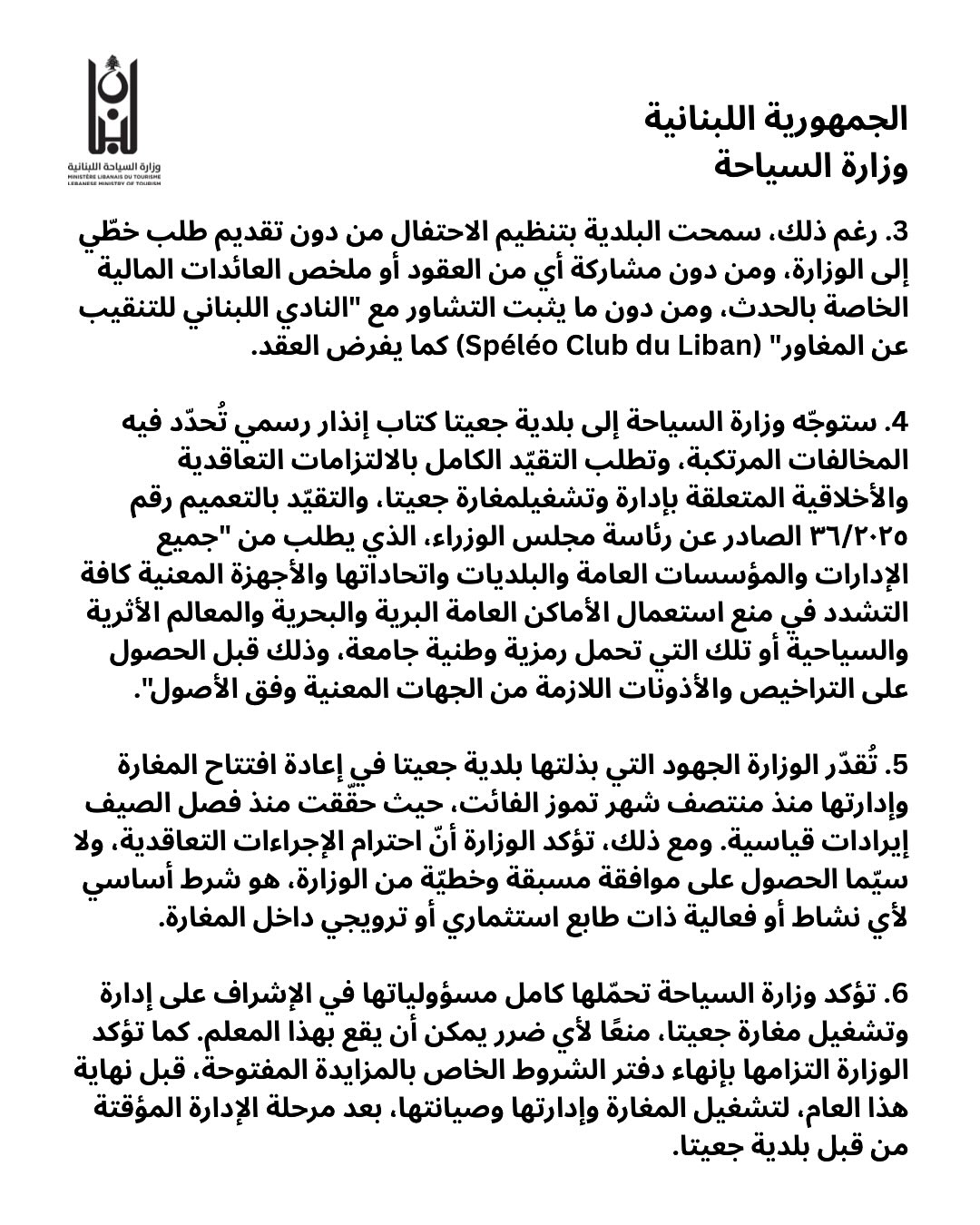 من جانبها أعلنت وزارة السياحة أنها ستوجه كتاب إنذار رسمي إلى بلدية “جعيتا”، توضح فيه المخالفات المرتكبة، وتطلب التقيد الكامل بالالتزامات التعاقدية والأخلاقية الخاصة بإدارة وتشغيل مغارة جعيتا.
