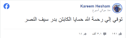 خلال يوم الأحد 26 أكتوبر الماضي، أعلن كريم هشام زوج زيزي سيف النصر، وفاة الكابتن بدر الدين، ونعاه في منشور قال فيه: “توفي إلى رحمة الله حمايا الكابتن بدر سيف الدين”.
