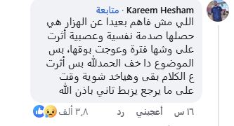 هذه الحالة أوضحها زوجها الكاتب كريم هشام تعليقًا على الفيديو، حين قال: "اللي مش فاهم بعيدًا عن الهزار، هي حصل لها صدمة نفسية وعصبية، أثرت على وشها فترة وعوجت بوقها، بس الموضوع دا خف الحمد لله، بس أثرت على الكلام بقى وهياخد شوية وقت على ما يرجع يزبط تاني باذن الله".
