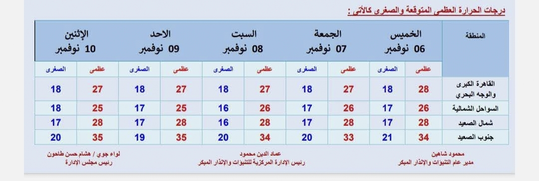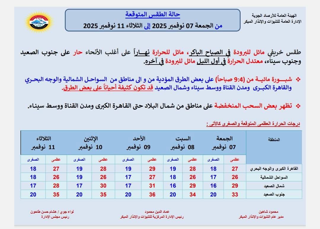 أما عن طقس الأسبوع المقبل في القاهرة بدءًا من يوم الجمعة الموافق 7 نوفمبر وحتى الثلاثاء الموافق 11 نوفمبر الجاري، فسيكون الطقس خريفي مائلًا للبرودة في الصباح الباكر، مائلًا للحرارة نهارًا على أغلب الأنحاء، حار على جنوب الصعيد وجنوب سيناء، معتدل الحرارة في أول الليل مائل للبرودة في آخره.