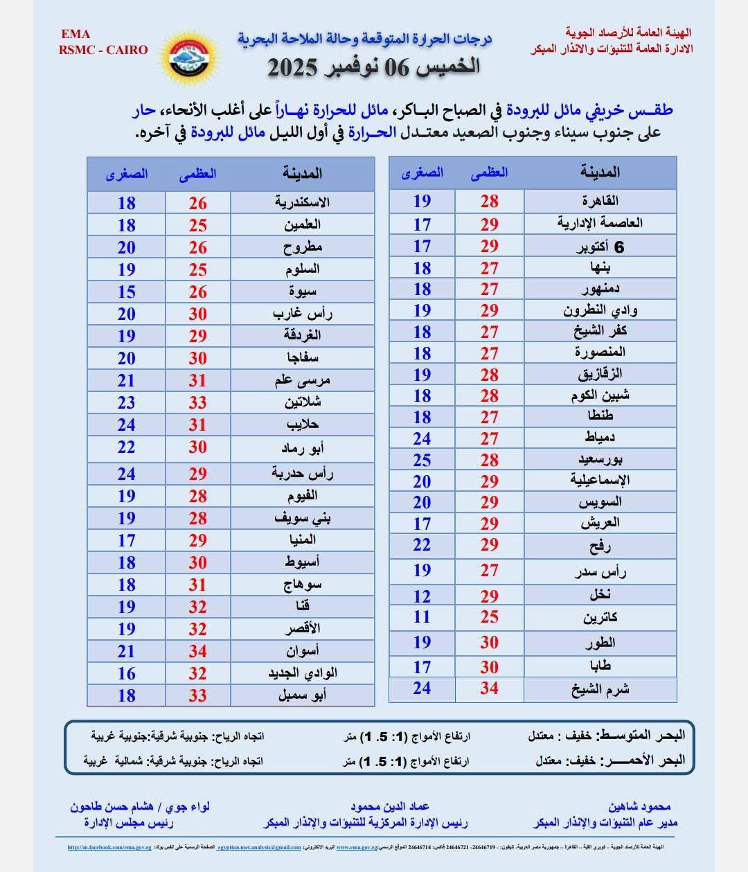 وقالت الهيئة العامة للأرصاد الجوية، إن طقس الأيام المقبلة، خاصة يوم الخميس الموافق 6 نوفمبر الجاري، خريفي مائل للبرودة في الصباح الباكر، مائل للحرارة نهارًا على أغلب الأنحاء، حار على جنوب سيناء وجنوب الصعيد ، معتدل الحرارة في أول الليل مائل للبرودة في آخره.