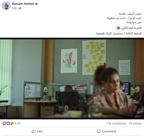 وفي الوقت نفسه، كتب حسام حامد مخرج مسلسل كارثة طبيعية، عبر منشور له عبر صفحته على منصة “فيسبوك”: "حبيت أسيب علامة حتى لو ورا، حتى لو صغيرة، بس موجودة.. الحرية لفلسطين".