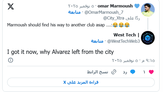 عبر مشجعو مانشستر سيتي عن استيائهم من طريقة تعامل جوارديولا مع النجم المصري عبر منصة "إكس" (تويتر سابقًا)، حيث كتب أحدهم: "يجب على عمر مرموش الرحيل في يناير، من الواضح أنه لن يحصل على فرصة حقيقية، على النادي السماح له بالانضمام لمنتخب بلاده، فجوارديولا لا يمنحه أي اهتمام".