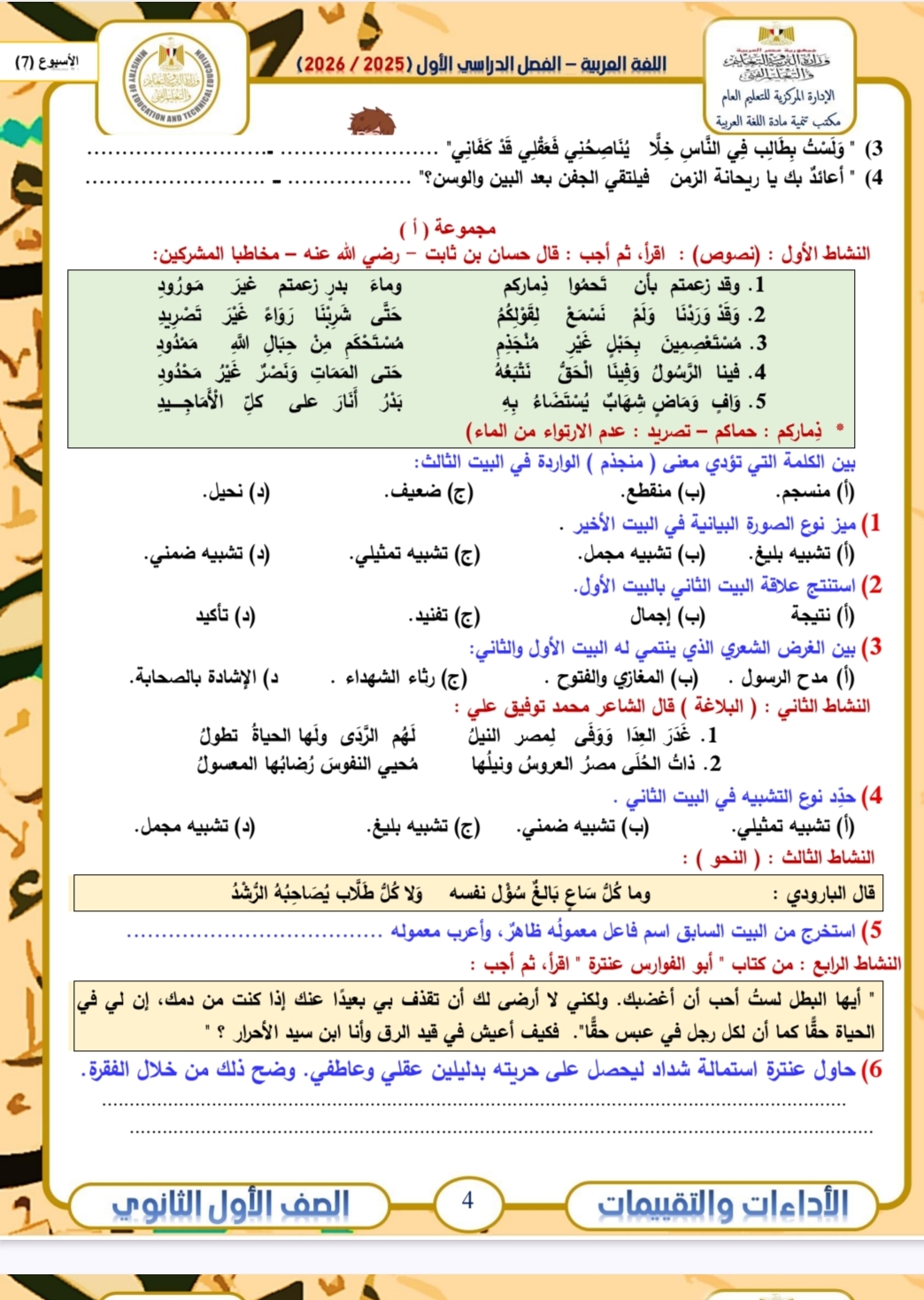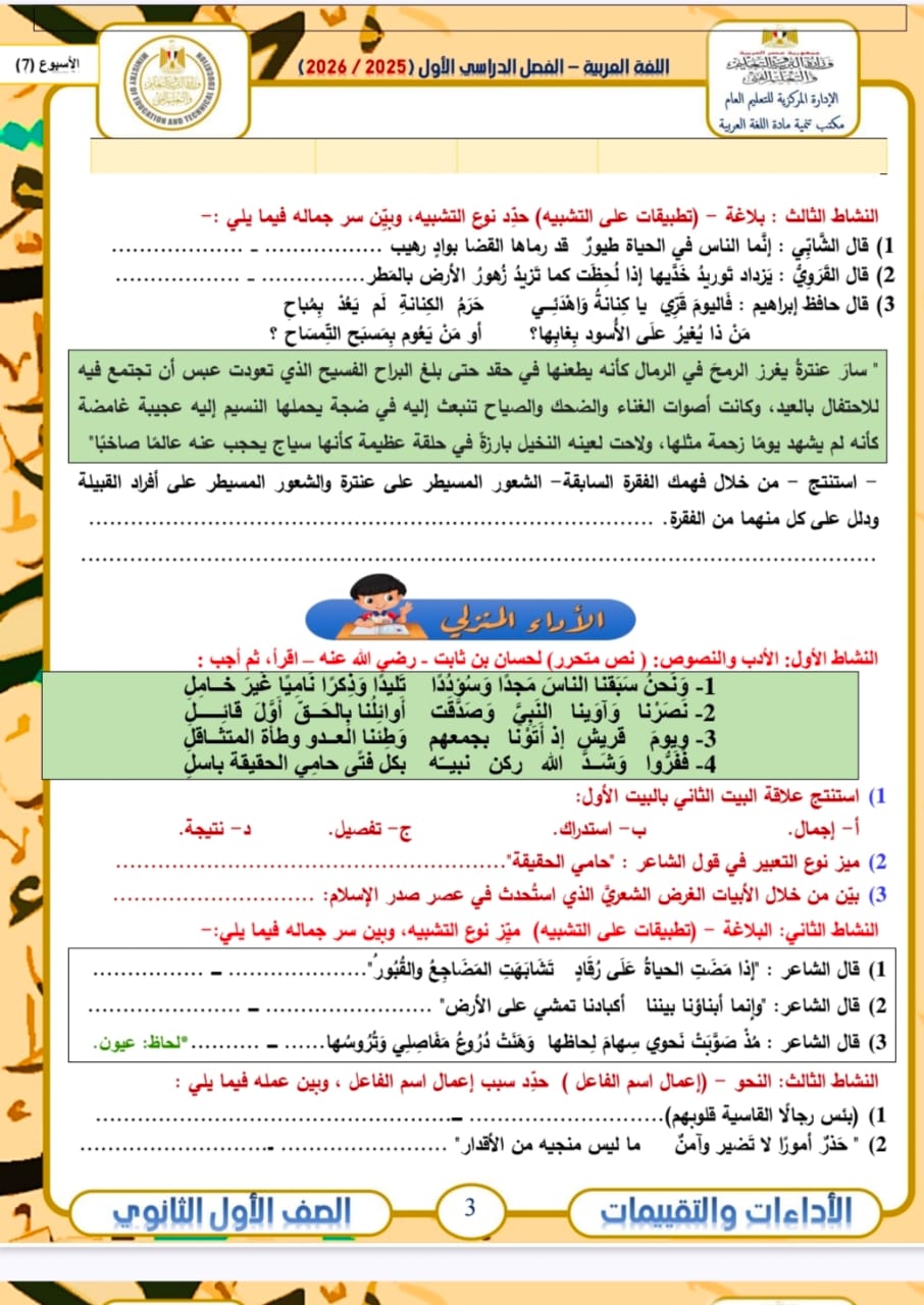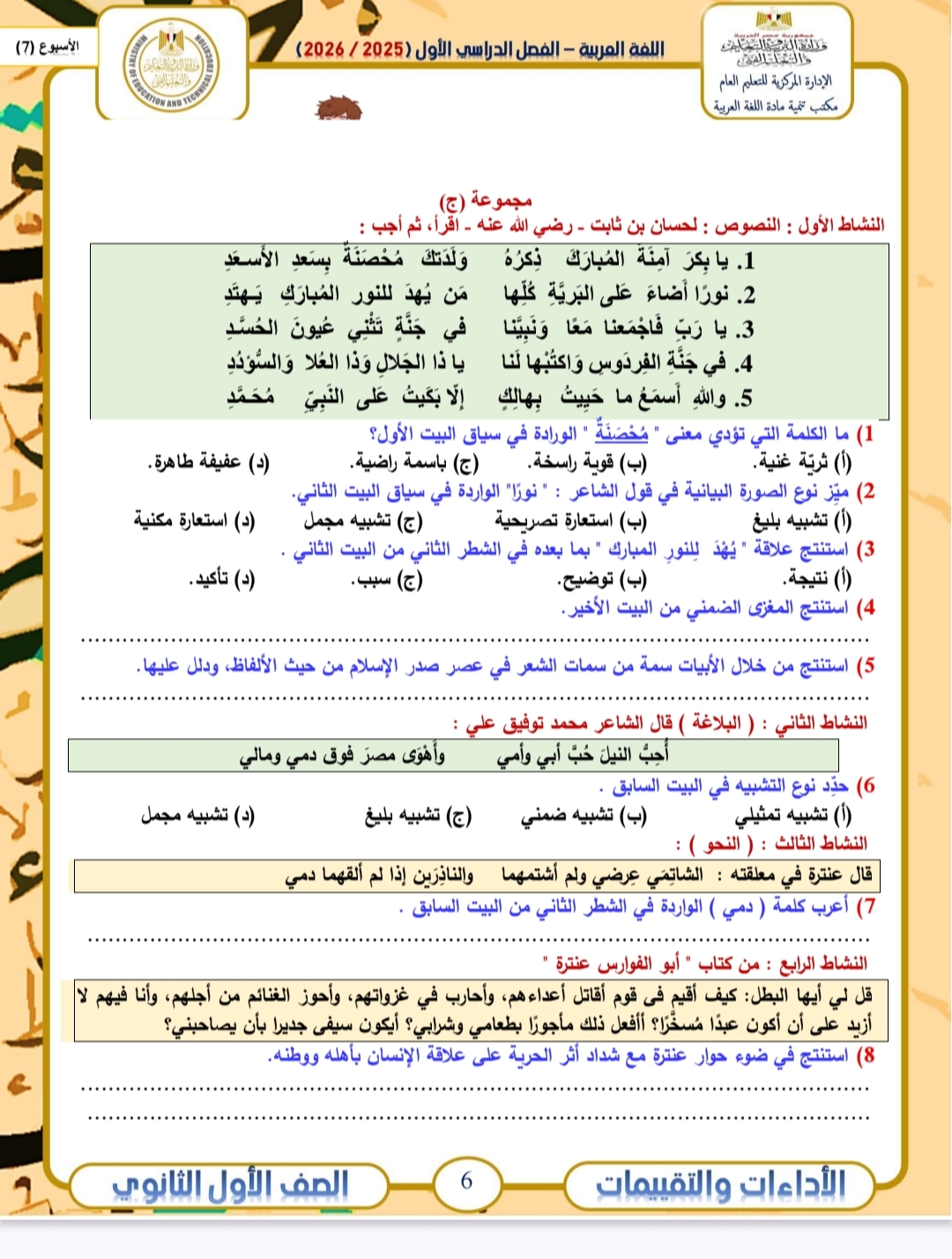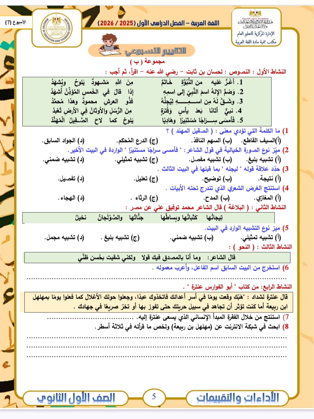 التقييم الأسبوعي للصف الأول الثانوي عربي