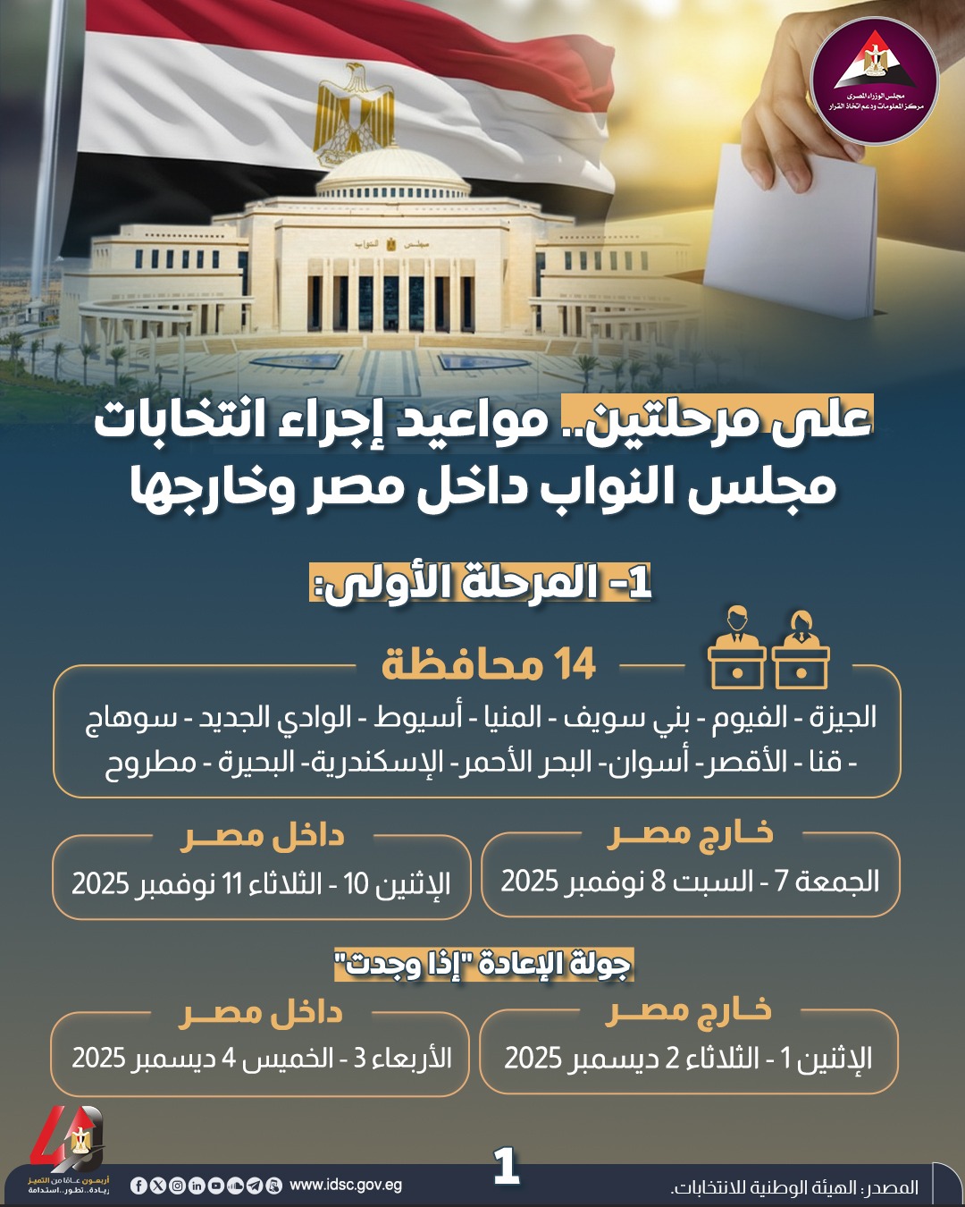 أعلنت الهيئة الوطنية للانتخابات، عن مواعيد انتخابات مجلس النواب 2025، داخل مصر وخارجها وكذلك محافظات المرحلة الأولى من انتخابات مجلس النواب.