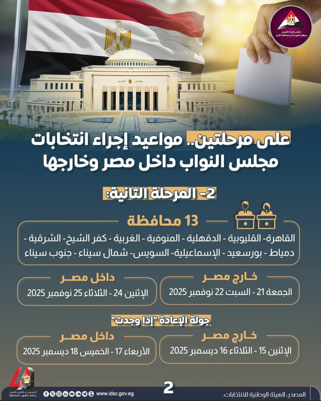 أما عن المرحلة الثانية في انتخابات مجلس النواب فتكون فى الخارج يومي 21 و22 نوفمبر، بينما تجري انتخابات مجلس النواب في الداخل 24 و25 نوفمبر، على أن تعلن النتيجة للمرحلة الثانية يوم 2 ديسمبر.