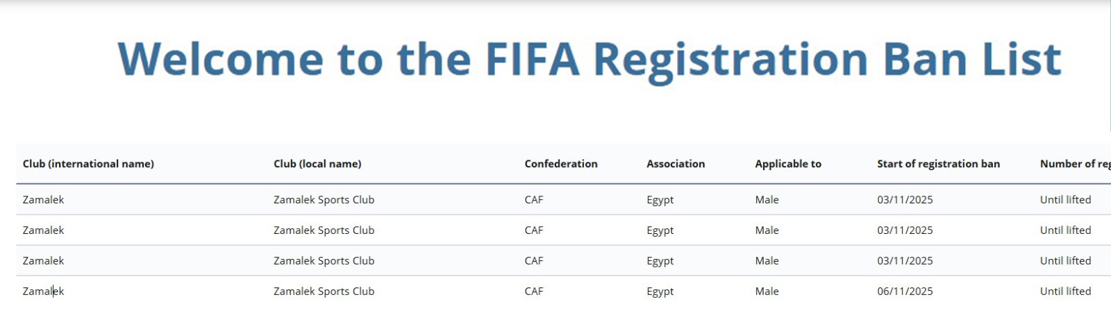 أدرج الاتحاد الدولي لكرة القدم (فيفا)، اسم نادي الزمالك ضمن قائمة الأندية الممنوعة من قيد لاعبين جدد، وذلك للمرة الرابعة في تاريخه، بسبب أربع قضايا مختلفة لم يتم حلها بعد.