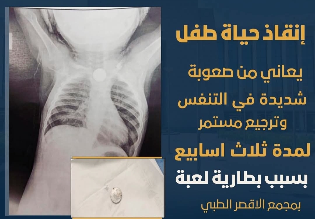 ونجح الفريق الطبي، في استخراج الجسم الغريب “حجر بطارية خاصة بلعبة أطفال” دون أي مضاعفات، في عملية بالغة الدقة استغرقت وقتًا وجيزًا لإنقاذ حياة الطفل.