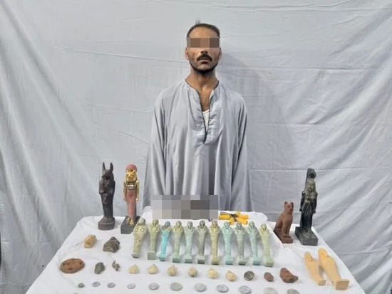 وبعرض الآثار على لجنة أثرية، أقروا بأثرية جميع القطع، وأنها ترجع للعصر الفرعوني، وباستكمال التفتيش تم العثور على سلاح ناري عبارة عن فرد خرطوش محلي الصنع عيار 16 مم، وعدد 6 طلقات من ذات العيار.