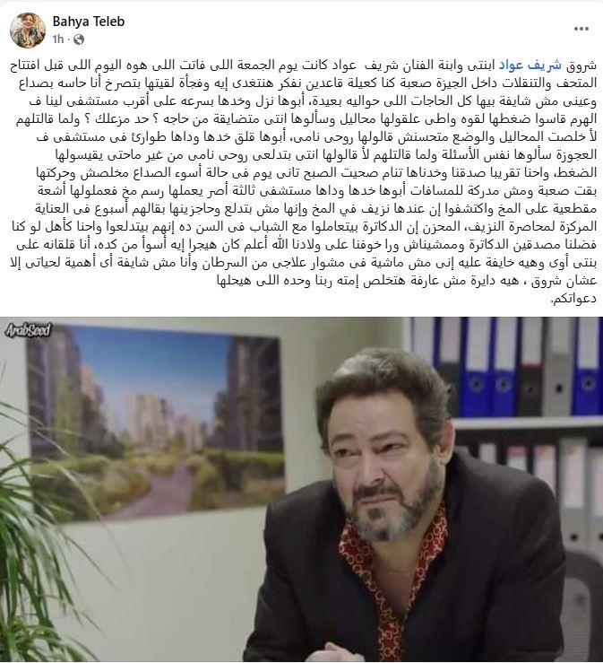 ونشر شريف عواد، عبر صفحته الرسمية على "فيسبوك" منشورًا قال فيه: "بنتي حبيبتي قلبي شروق في العناية المركزة، يا رب يا شافي يا معافي، يا لطيف اشفيها وعافيها، وأجر يا مولانا لطفك الخفي في أمرها".
