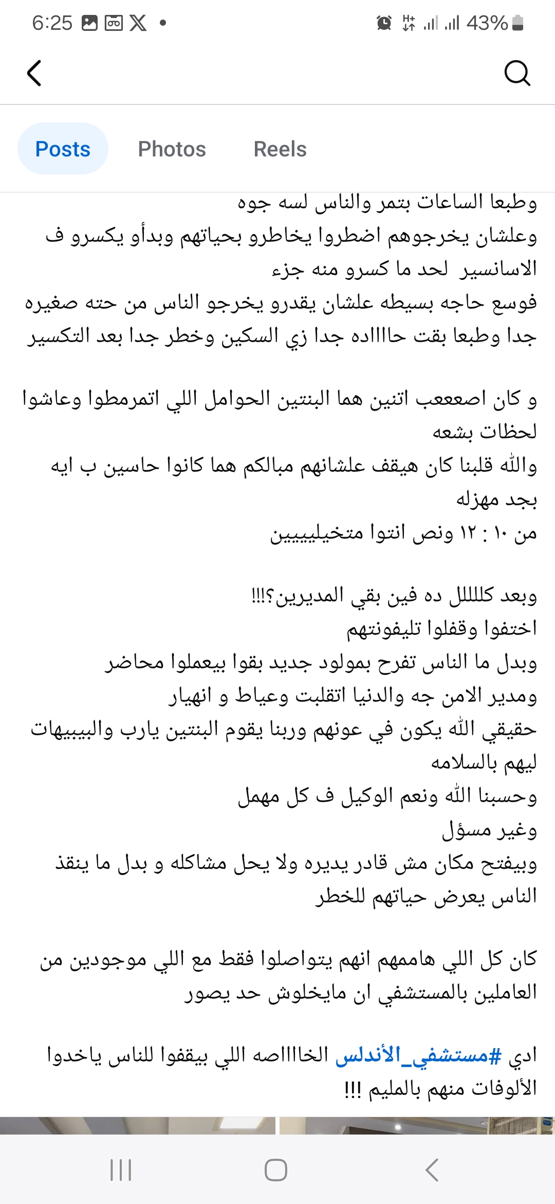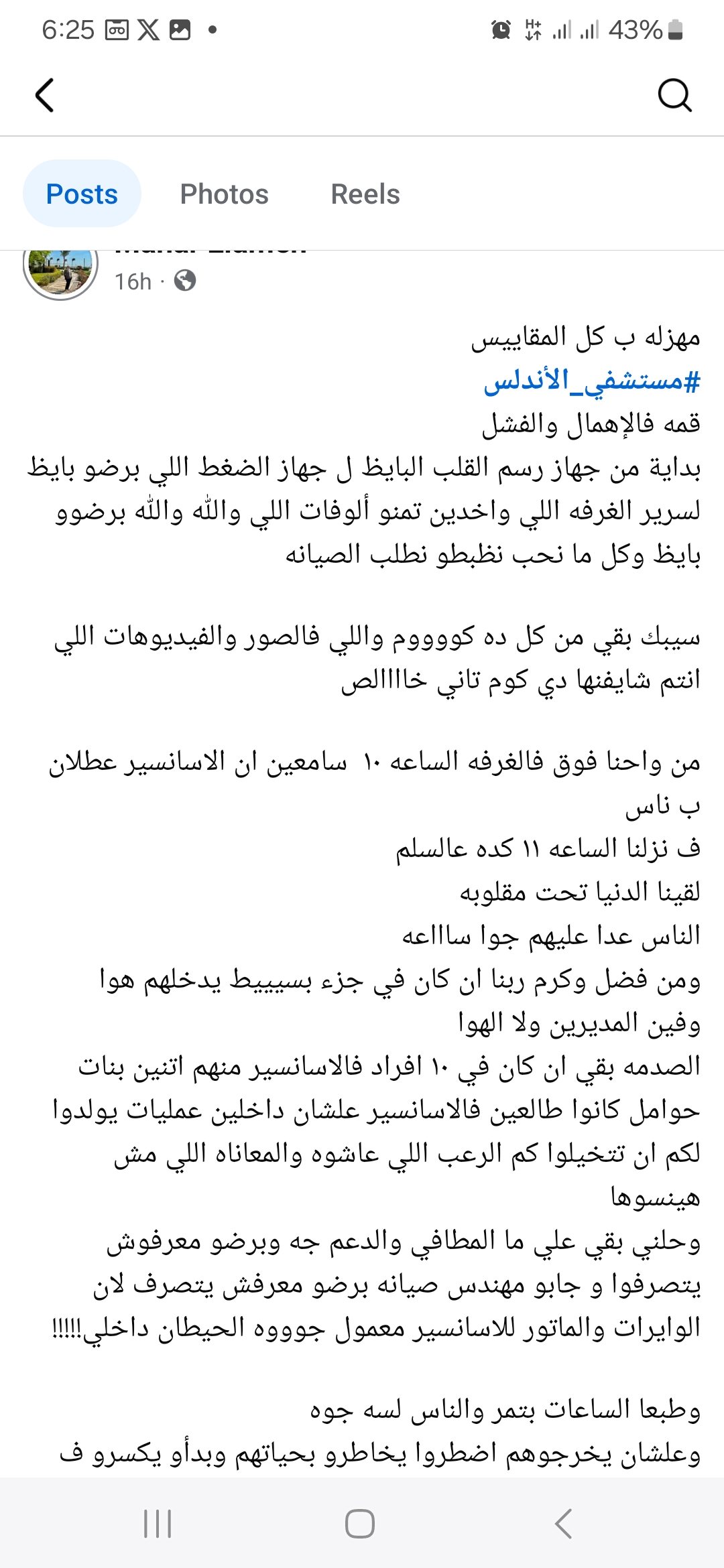 ومن بين الشهادات التي نُشرت عبر موقع "فيسبوك"، قالت إحدى المتواجدات بالمستشفى: "من الساعة 10 وإحنا سامعين إن الأسانسير عطلان وفيه ناس جواه، نزلنا حوالي الساعة 11 على السلم، لقينا الدنيا مقلوبة، الناس عدا عليهم أكتر من ساعة، ومن فضل ربنا كان في فتحة بسيطة بتدخل لهم هوا".