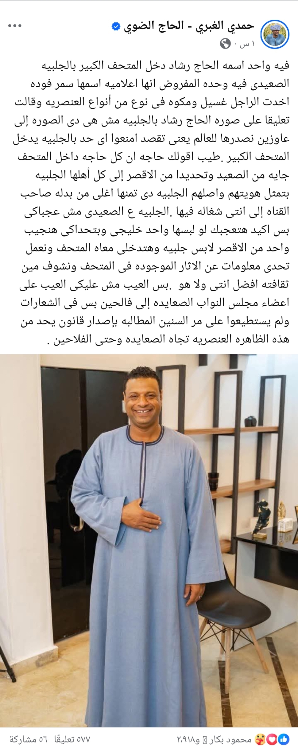 أثار تصريح منسوب لإحدى الإعلاميات حول دخول مواطن صعيدي مرتديًا الجلابية إلى المتحف المصري الكبير جدلًا واسعًا على مواقع التواصل الاجتماعي، بعدما اعتبرت ظهوره "غير مناسب لتصديره للعالم"، وهو ما اعتبره كثيرون إساءة وتمييزًا عنصريًا ضد الصعيد وأهله.