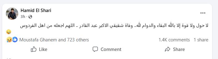 وكتب الشاعري عبر حسابه الرسمي على موقع التواصل الاجتماعي "فيسبوك": "لا حول ولا قوة إلا بالله، البقاء والدوام لله.. وفاة شقيقي الأكبر عبد القادر، اللهم اجعله من أهل الفردوس الأعلى".