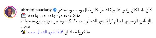 كما كشف في تعليقه عن موعد عرض الفيلم بدور السينما، حيث كتب: "الإعلان الرسمي لفيلم (ولنا في الخيال.. حب؟).. 19 نوفمبر في جميع سينمات مصر".