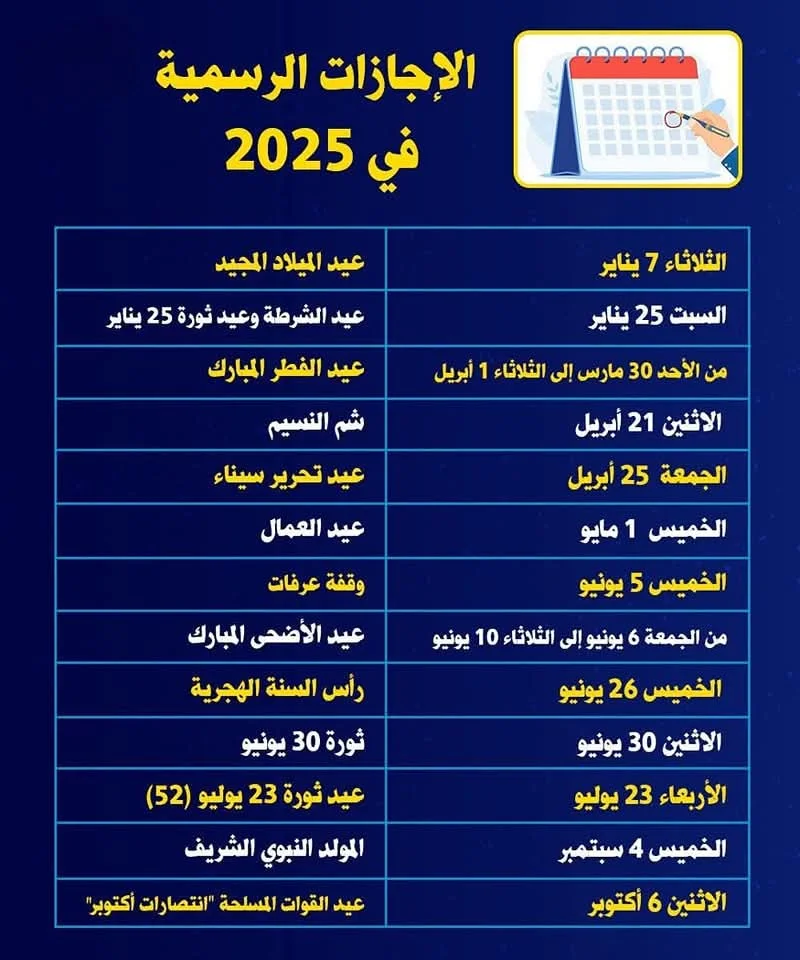 شهد عام 2025 عددًا من المناسبات الوطنية والدينية التي أُعلنت خلالها إجازة رسمية في مختلف قطاعات الدولة، وجاءت أبرزها كالتالي:
