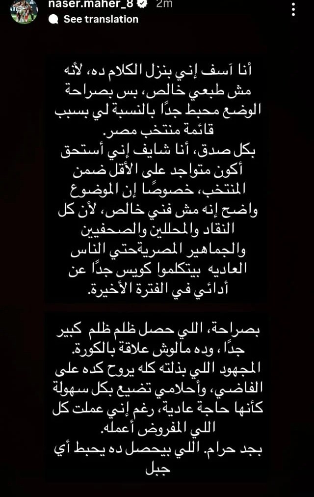عبّر لاعب الفريق الأول لكرة القدم بنادي الزمالك، ناصر ماهر، عن شعوره بالحزن والإحباط بعد استبعاده من قائمة منتخب مصر لمعسكر نوفمبر.