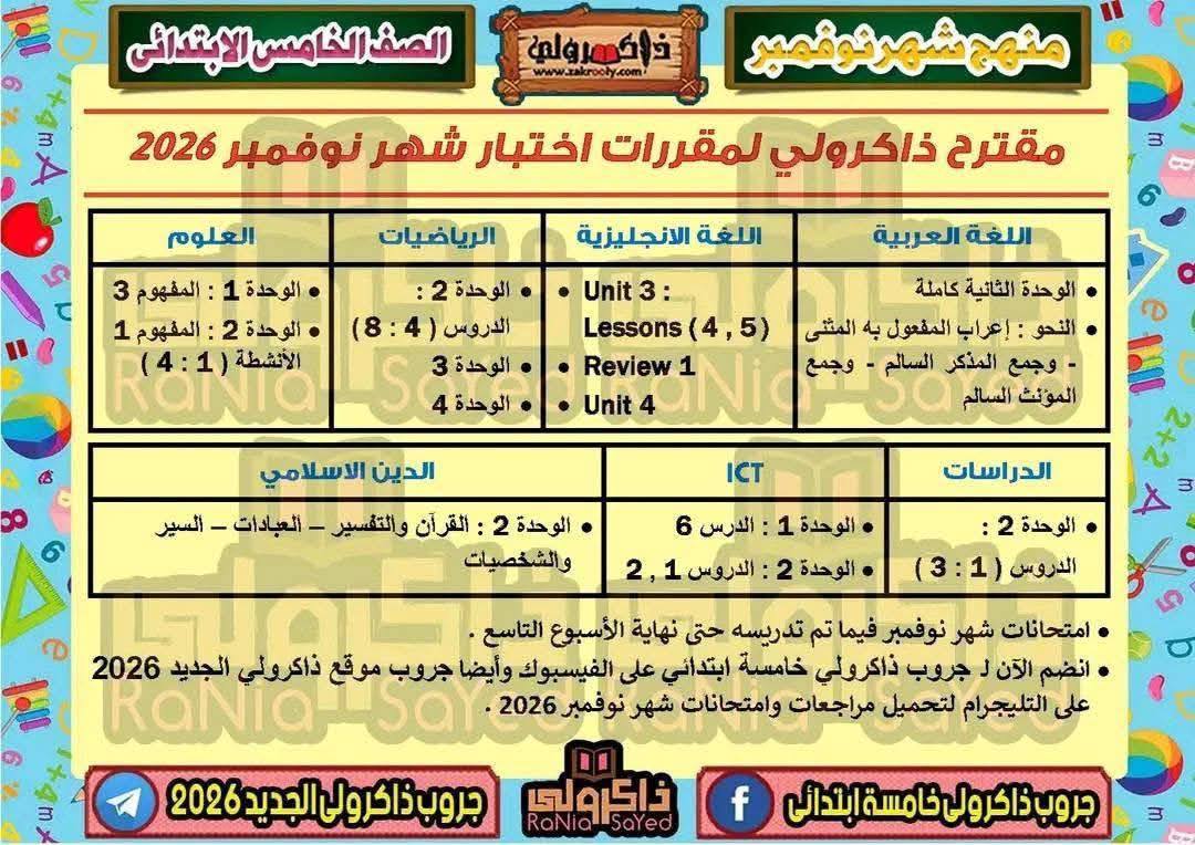مقرر امتحانات شهر نوفمبر 2025 لطلاب الصف الخامس الابتدائي