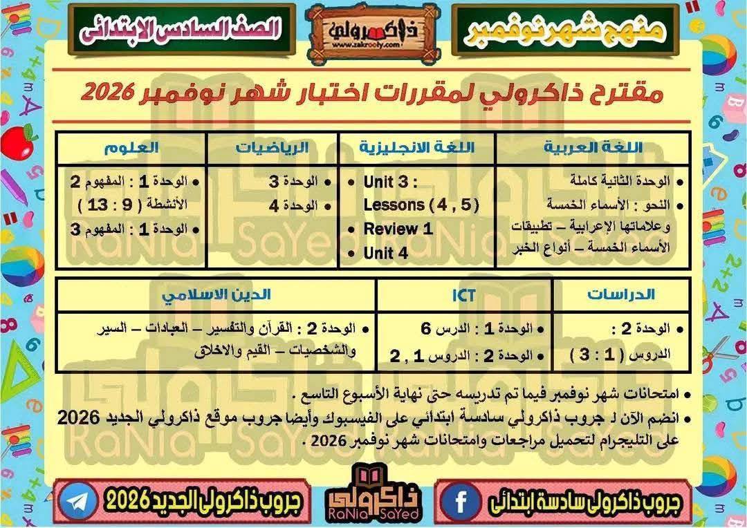 مقرر امتحانات شهر نوفمبر 2025 لطلاب الصف السادس الابتدائي