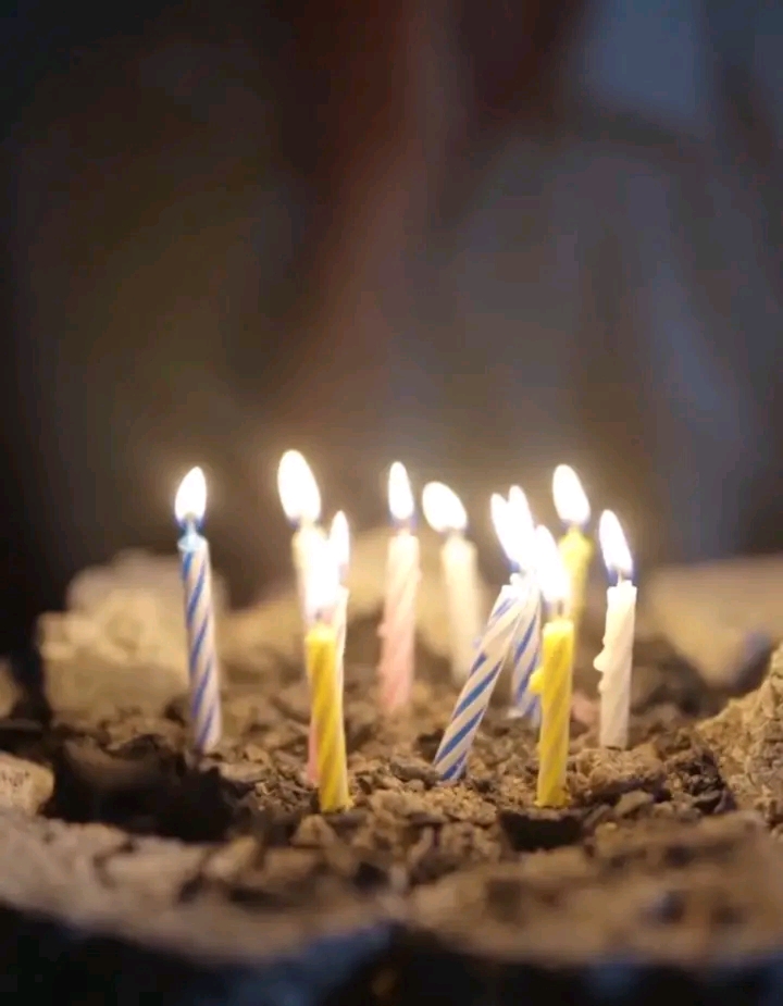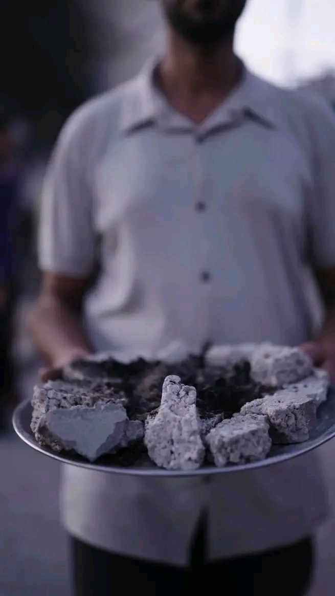 ظهر الشاب وهو يمسك صينية صغيرة، يجمع فيها التراب والحطب من بين أنقاض القصف، ثم يضع شمعة مضيئة فيها، كرمز للصمود والحياة وسط آثار الدمار المستمرة، لتكون هذه الصنية بديلًا عن كيكة عيد الميلاد وسط الظروف القاسية.