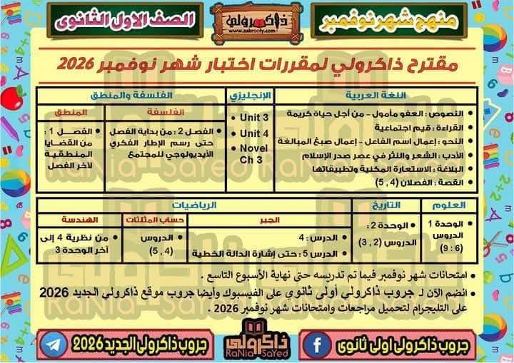مقرر امتحانات شهر نوفمبر 2025 لطلاب الصف الأول الثانوي