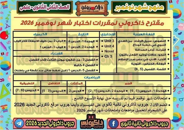 مقرر امتحانات شهر نوفمبر 2025 لطلاب الصف الثاني الثانوي علمي وأدبي
