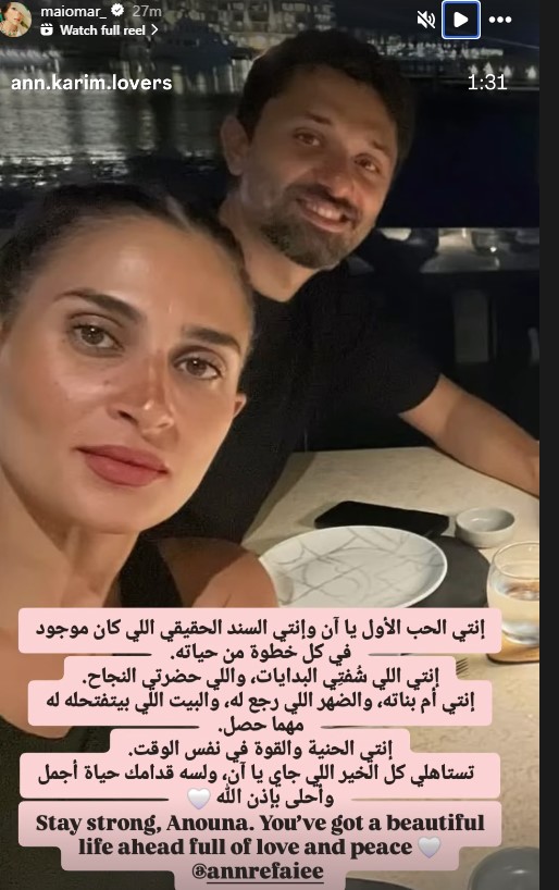 نشرت مي عمر عبر حسابها "إنستجرام" رسالة لـ آن الرفاعي، قالت خلالها: "إنتي الحب الأول يا آن، والسند الحقيقي اللي كان موجود في كل خطوة من حياته، إنتِي اللي شُفتي البدايات، واللي حضرتي النجاح، وأم بناته، والضهر اللي بيرجع له، والبيت اللي بيتفتح له مهما حصل".
